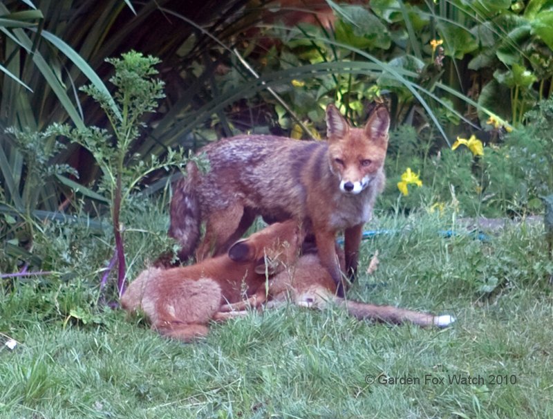 Although the cubs have been entirely capable of eating solid food for quite a while now, and indeed of choosing their own food from what’s put out for them to eat… or play with… sometimes, only the Milk Bank of Mum will do. Apparently fox cubs may still suckle up to twelve or fourteen weeks of age (so says Stephen Harris’s Urban Foxes book, which I am currently reading). Given that I saw the first cub above ground on 14th April, I suppose ours are now somewhere around the three month mark…