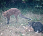 I had forgotten just how much Lardy Cat likes crispy bacon. Enough, it transpires, to sit there eating it off the grass while one of the fox cubs ate the rest of the food just a few feet away…