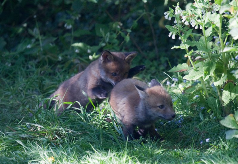 As you may recall, the cubs start off with comparatively dark fur — almost black, or dark grey at least. They were definitely on the grey side when they first came out into the open. But by the end of April — these photos were taken on the 27th — they were beginning to lose the darker fur and turn the ginger colour you’d more usually associate with foxes. In some of these, they really look a bit piebald!